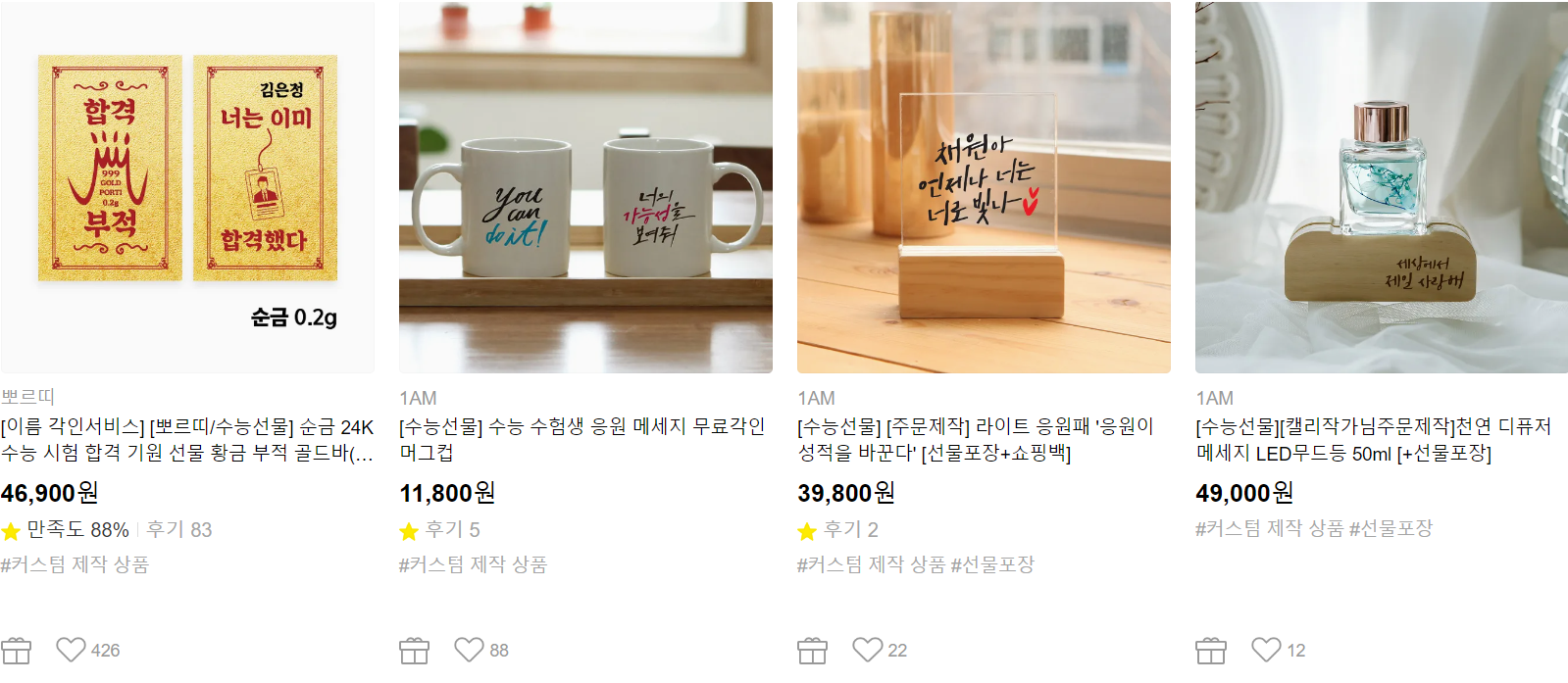 커스텀 제작 상품도 의미 있는 선물입니다. 응원의 메시지가 담긴 선물은 수험생에게 큰 힘이 될 수 있고 기억에 더 오래 남는 법이기도 하니까요. 하나뿐인 수능 선물을 원한다면 커스텀 제작 상품 추천합니다.
